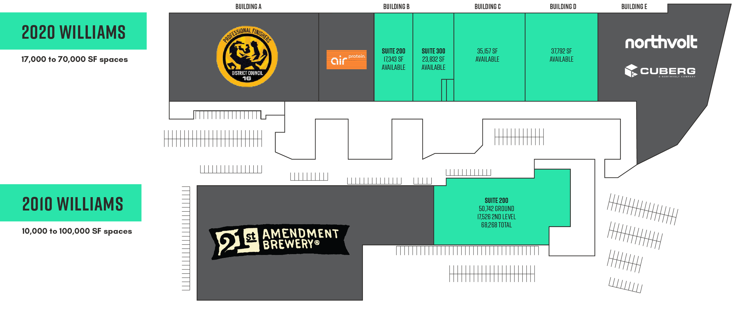 Polished concrete floors, large windows, and plenty of natural light, these large open floor plans support a variety of makers and manufacturers.